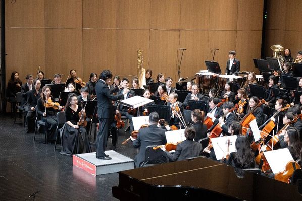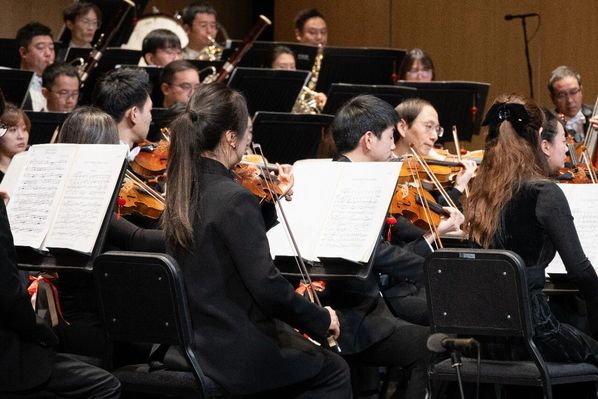 “这场新年音乐会,犹如一部由全校师生共同谱写的艺术交响。”浙师大交响乐团(金华市交响乐团)团长兼常任指挥陶纪泉回忆道,从九月起,60余位师生便开始了密集排练。每周三晚七点至九点是雷打不动的集中排练时间,从每周数次到临近演出时的每日锤炼,排练厅的灯火常亮至深夜。“整场演出结构宏大,上半场与下半场主要为纯器乐演奏,之后则是交响乐与声乐的融合呈现。”他介绍,“为呼应‘相约七秩芳华、共谱浙师风雅’主题,我们在曲目编排中融入了金华本土文化元素,秉持‘校地共建’理念,力求实现兼具本土性与精致感的艺术表达。”