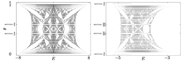 图 1 扭转光晶格中的分形能谱,左:扭转角在[0, π/2]之间的能谱;右:扭转角在[arc cos(3/5), arc cos (4/5)]之间的部分能谱。