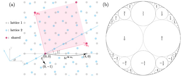 该分形结构源于莫尔超晶格的数论特性——当转角满足特定有理数条件时,系统的精确元胞面积由毕达哥拉斯三元组决定,并自然形成“阿波罗尼奥斯垫片”(Apollonian gasket)这一经典分形几何结构(见图2)。这一发现揭示了莫尔物理与纯数学之间的深刻联系,并提供了一种通过转角“旋钮”高效调控量子分形的新范式。