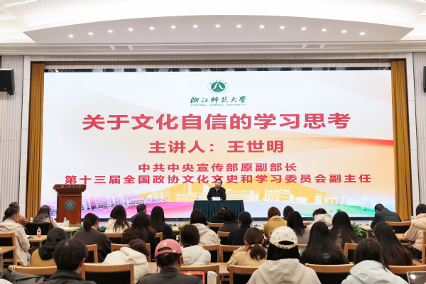 中共中央宣传部原副部长、第十三届全国政协文化文史和学习委员会副主任王世明作题为《关于文化自信的学习思考》的专题讲座。浙师大融媒体中心 孙叶 摄