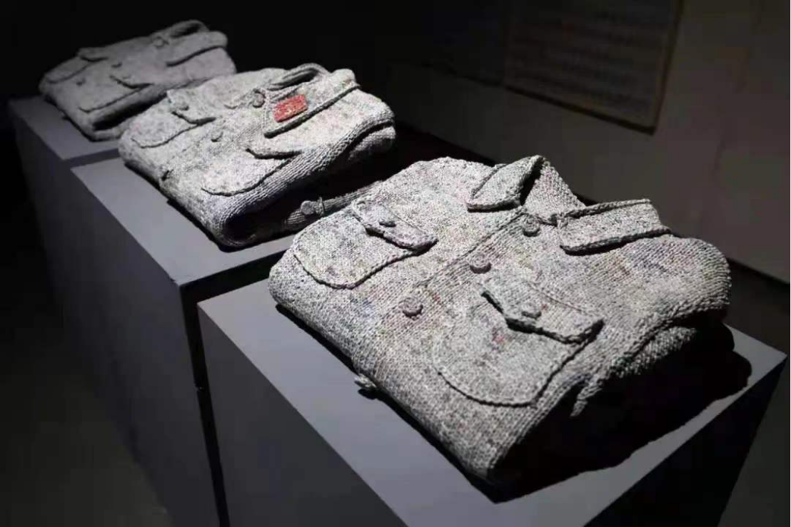 “这件作品用一整年的《解放军报》制作,先剪下每期报纸上的人物照片,用他们拼接成一个个五角星,再把剩余的报纸裁成条、搓成线,手工编织成老兵军装和军帽,平均每套军装要做三四个月。”