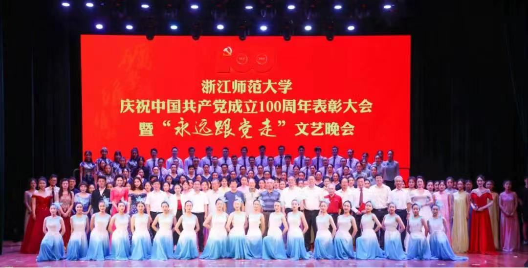 这是浙江师范大学庆祝中国共产党成立100周年表彰大会暨“永远跟党走”文艺晚会的演出现场。颁发“光荣在党50年”纪念章、表彰“两优一先”、重温入党誓词,以及师生们自编自演的节目,富有震撼力的表演,将党史学习教育推向高潮。