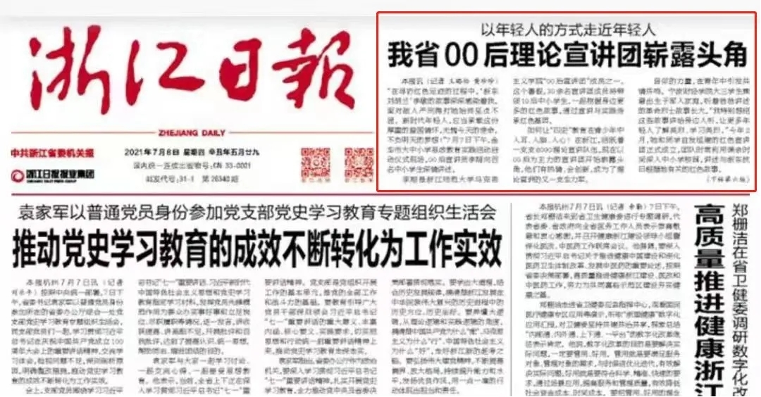 《浙江日报》头版报眼位置报道浙师“00后”理论宣讲团崭露头角。