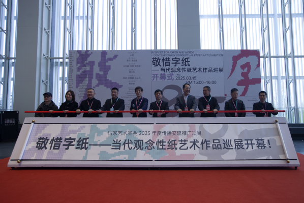 现场,尼跃红宣布“敬惜字纸——当代观念性纸艺术作品巡展”开幕,朱毅峰、王岭、郑军德、吴晓明、康雷、陈政、刘立冬、杨大伟、王雷上台共同启动开幕装置。