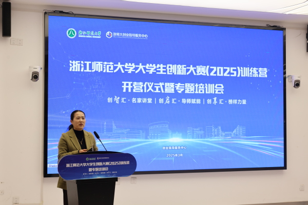 近日,浙江师范大学大学生创新大赛(2025)训练营开营仪式暨专题培训会在浙师众创空间路演室举行。浙师大党委副书记吕迎春出席并讲话。