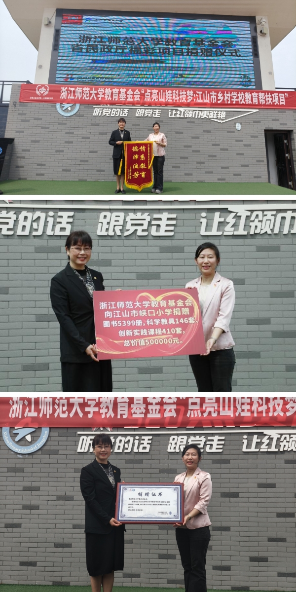 捐赠仪式上,浙师大教育基金会向峡口小学捐赠5399册图书、146套科学教具及410套创新实践课程,总价值近50万元。峡口小学校长向浙师大教育基金会回赠锦旗和证书。