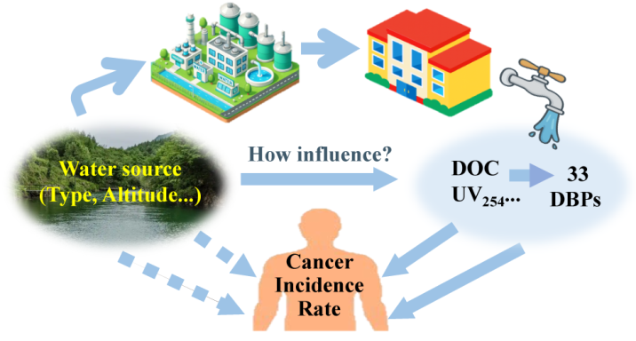 研究发现:该区域自来水水质与地理格局密切相关。北部平原地区因河流和浅湖为主要水源,有机物水平(DOC、UV254为指标)普遍较高,导致三卤甲烷、碘代三卤甲烷、卤乙酸与卤乙腈浓度也显著偏高,且在冬季较为突出;而南部山区更多依赖水库水源,海拔较高,水质(有机物和DBPs)明显优于北部。降雨虽能影响溴离子浓度,但溴代DBPs的形成更多受有机前体特征支配,而非单纯由溴离子含量决定。值得注意的是,碘代THMs、三卤乙酸及溴代DBPs(包括Br-THMs,Br-HAAs,Br-HANs)水平较高的区域,居民总癌症发病率亦呈升高趋势;同时,低海拔、UV254值偏高的水源地与较高健康风险存在潜在关联。该研究强调,未来需进一步加强对高毒溴/碘代DBPs的监测与控制,推动水源保护与消毒工艺优化的结合,为饮用水安全与公共健康风险管理提供科学依据。该论文工作得到国家自然科学基金、省自然科学基金的资助。