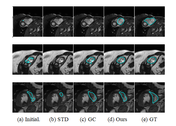 本研究的核心创新在于采用空间连续优化框架,成功消除了图优化方法固有的网格计量偏差,避免了传统方法中的离散化伪影。该方法具有三大关键优势:(1)无需特定的几何模板或预定义形状;(2)对分割和形状参数的初始化都表现出鲁棒性;(3)在不同目标形态下都保持有效性。此外,研究还开发了一种基于软阈值动力学(STD)的新型原对偶优化算法,参数更少、实现简单、收敛更快。同时在多个医学影像数据集上进行了系统的临床验证,展现出显著的性能提升和临床应用价值。在ACDC心脏右心室MRI分割任务中,作为后处理模块,本方法将训练良好的U-Net的F1分数提升14.9%,同时Hausdorff距离改善35.5%。在前列腺分割任务中,本方法与V-Net结合使用时,Dice系数提高21.4%;当采用迭代优化策略后,性能得到进一步显著提升。在极端初始化条件下以及在噪声测试中,本方法表现出优良的鲁棒性(如图2所示)。为验证所提出方法的广泛适用性,研究还在Weizmann自然图像数据集上进行了测试。结果表明,与使用最小训练样本的U-Net相比,本方法的F1分数提升了27.0%,计算时间仅为图紧凑性方法的11.9%。这些结果充分证明了该方法不仅在医学影像领域表现优异,同时具备跨领域的泛化能力和鲁棒性,为其在更广泛的计算机视觉任务中的应用奠定了基础。此外,对于需要凸形状约束的特定分割任务,研究将提出的紧凑性模型与凸形状(CS)块集成,形成了紧凑性-CS框架。该框架能够在实现分割的同时满足凸性要求并保持几何连续性,在前列腺等栗子形器官分割任务中表现尤为出色(如图3所示)。为推动医学影像智能分析系统的临床转化提供了重要技术支撑。其跨领域的广泛适用性进一步证明了该方法的通用性和实用价值,代表了在弥合变分方法与基于学习的图像分割方法之间差距方面迈出的重要一步。
