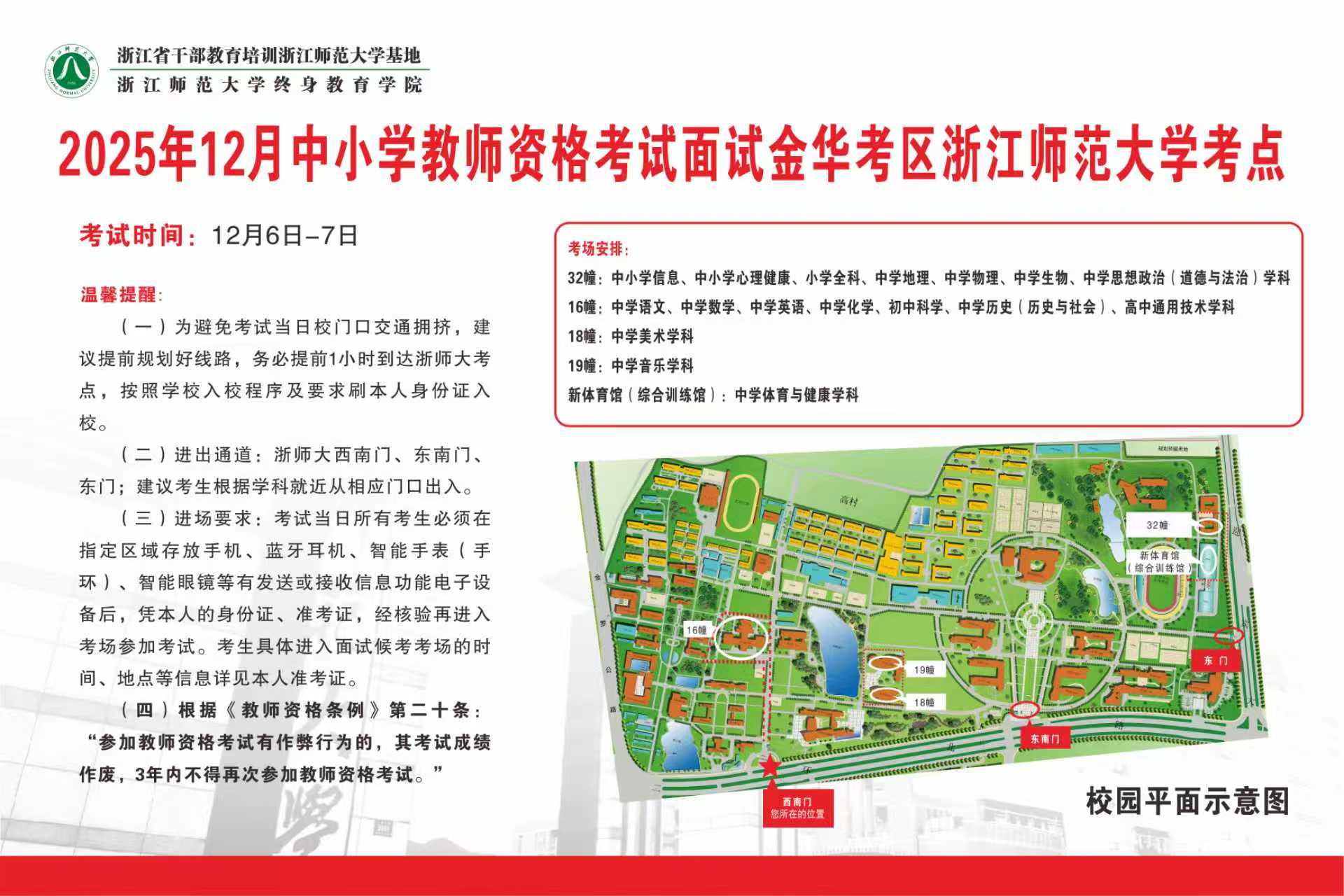 2.进出通道:浙师大西南门、东南门、东门;建议考生根据学科安排分布就近从相应门口出入。
