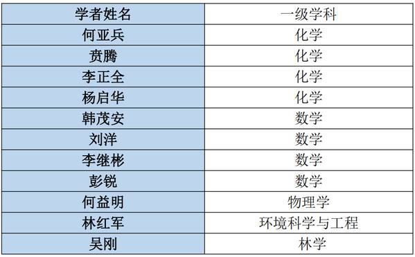 浙江师范大学共11名学者上榜(位列全国第102位,数量相同时并列排序)。我校本次上榜学科分布在理学、工学和农学三个学科门类,涉及化学(4人)、数学(4人)、物理学(1人)、环境科学与工程(1人)、林学(1人)五个教育部一级学科。