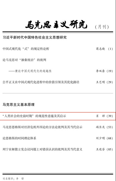 近日,浙江师范大学马克思主义学院教授肖祥在哲学社会科学权威期刊《马克思主义研究》2026年第03期上发表题为《“人类社会的史前时期”的规范性意蕴及其启示》的文章,该文系国家社科基金重点项目“中国式现代化的伦理基础研究”(24AZX002)的阶段性成果。