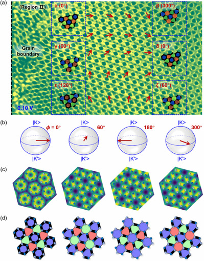 图:Kekulé螺旋序的实空间成像与相位提取。(a) 典型的谱学成像图,叠加的红色箭头表示从实验数据中提取的方位角,显示了相位在空间中的涡旋状变化;(b) 同位旋布洛赫球示意图;(c) 不同方位角下模拟的电荷密度分布;(d) 对应的Kekulé键序示意图。