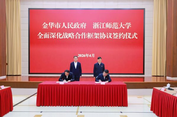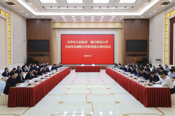 4月16日,浙江师范大学与金华市政府全面深化战略合作框架协议。市委书记朱重烈,浙师大党委书记蒋云良致辞并见证签约。市委副书记、市长张健,浙师大校长邱利民代表双方签约。市领导陆品能、李斌峰、庄凌飞、章旭升、黄慧,浙师大党政领导班子成员吕文革、林一钢、张建珍、吕迎春、朱毅峰、李盛、葛永海、刘洋出席。