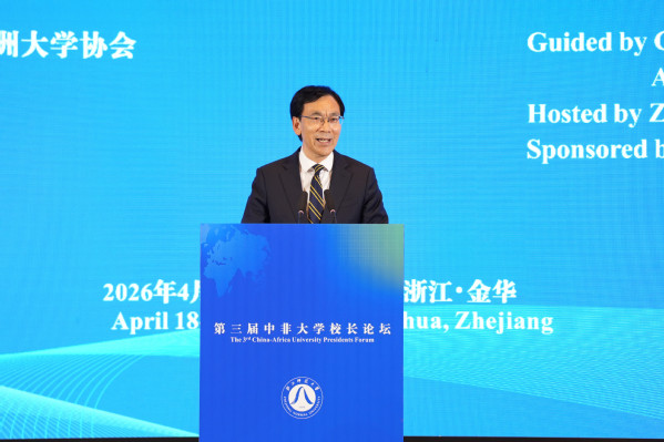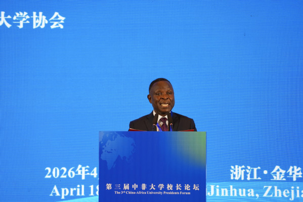 4月18日下午,以“协同·转型·可持续:共筑中非高等教育合作新样态”为主题的第三届中非大学校长论坛在金华万豪酒店举行。本届论坛是深入贯彻落实习近平总书记关于中非合作重要指示精神的生动实践,已正式纳入2026年“中非人文交流年”精品活动清单。论坛聚焦人工智能时代的人才联合培养、科研协同、数字教育共享与教师能力提升等关键议题,来自喀麦隆、莫桑比克、坦桑尼亚、南非等非洲国家的近40位大学校长与中方50余位校长、学者深入交流。中国高等教育学会副会长张大良、浙江省人民政府外事办公室主任顾建新、坦桑尼亚达累斯萨拉姆大学校长威廉·阿南基瑟、浙师大校长邱利民等出席并讲话,非洲大学协会秘书长奥卢索拉·奥耶沃勒视频致辞,浙师大副校长林一钢主持。