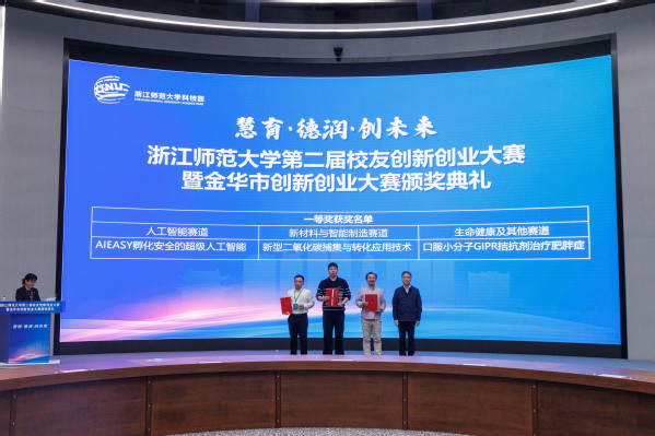 朱毅峰指出,本次大赛充分展现了浙师人敢闯会创的精神风貌,凝聚了政校企多方力量与师生校友智慧,为地方经济社会发展提供了强有力的人才与科技支撑,为金华打造浙江中西部科创中心注入了新动能。恰逢学校70周年校庆,校地签署全面深化战略合作框架协议,朱毅峰希望广大校友投身金华创新创业主战场,并承诺持续优化创新创业生态,完善孵化、对接、落地服务,推动四链融合,以最优政策、最好服务支持浙师大建设和校友创业,共同打造校地协同创新典范。