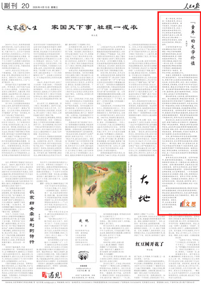 4月15日,人文学院吴翔宇教授在《人民日报》(2026年04月15日20版)发表题为《“童年”的文学价值》的文章。