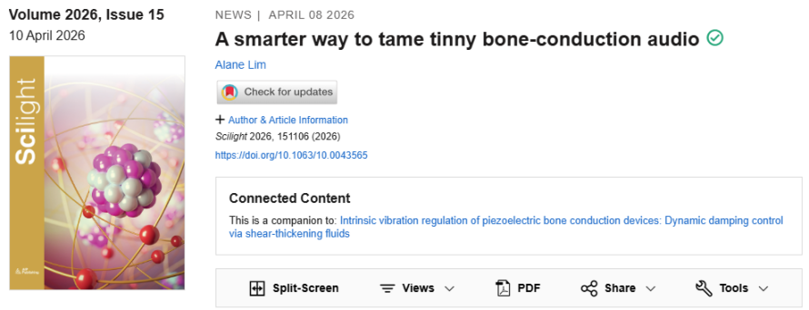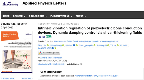 近日,工学院温建明教授课题组在压电骨传导器件本征振动调控领域取得重要进展,相关研究成果以“Intrinsic vibration regulation of piezoelectric bone conduction devices: Dynamic damping control via shear-thickening fluids”为题发表于应用物理权威期刊 Applied Physics Letters 。工学院2023级硕士研究生金士玉为论文第一作者,温建明教授和马继杰副教授为论文共同通讯作者。该研究成果被编辑遴选为期刊最佳论文(Featured Article),并被美国物理学联合会《科学之光》(AIP Scilight)专访报道。