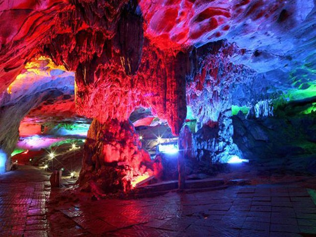 Entering the cave on a small boat on a shallow underground stream via a head-bashingly low passageway, visitors are treated to a larger cavern space with interesting formations in the rock, dubbed, as in all old Chinese scenic sites, with creative and whimsical names. Double Dragon Cave is one of several caves in the area, each of which has its own notable history and features. Also nearby is a large reservoir and a temple.